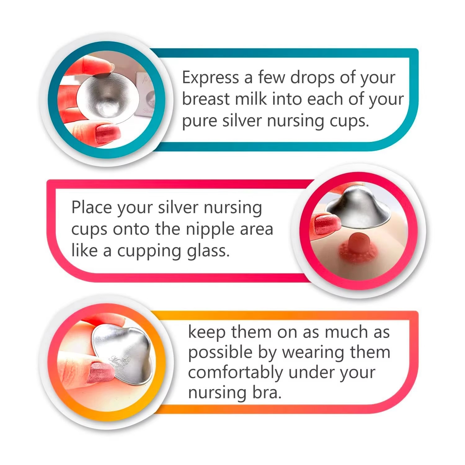 Wyroby z:100% czystego srebra 999 lub wysokiej jakości srebra 925, te kubki są oryginalnym, klinicznie sprawdzonym rozwiązaniem na łagodzenie i gojenie bólów, pękniętych sutków podczas karmienia piersią.Wykorzystują naturalne srebra.właściwości przeciwdrobnoustrojowe, przeciwzapalne i leczniczeZapewniają one natychmiastową ulgę i przyspieszają regenerację.Wielokrotnie używalne, przyjazne dla środowiska i zaprojektowane w celu zapewnienia długotrwałego komfortu, są niezbędne dla każdego zestawu niezbędnych rzeczy dla matek karmiących.